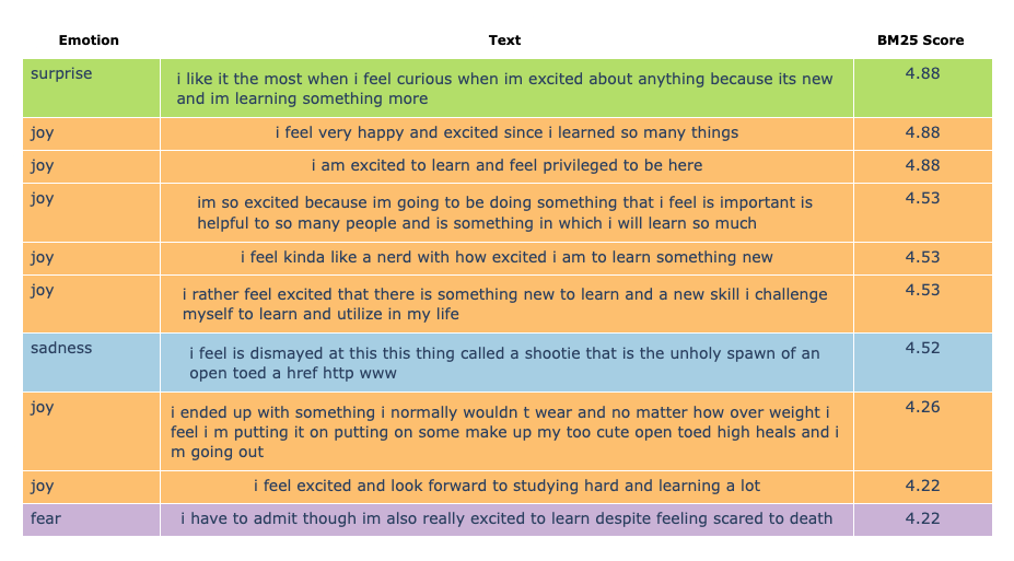 For example, getting the texts and their emotion label containing the phrase excited to learn is a matter of applying filter on the relation defined above: