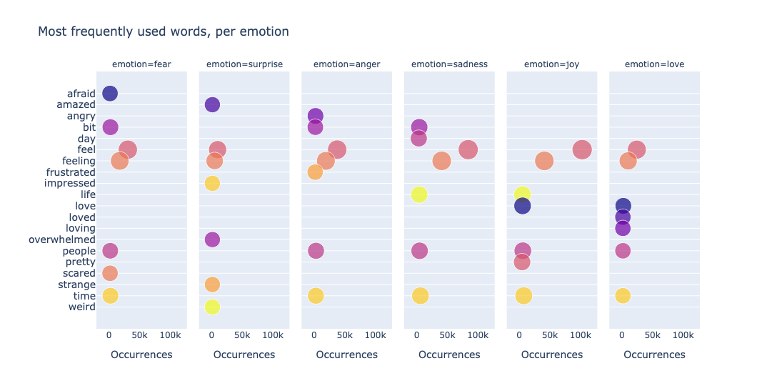 We can also visualize the data to gain insights. One simple and effective approach is to plot the most frequently used words. By counting token occurrences across the dataset and displaying them in bubble plots, we can quickly identify dominant themes, repeated keywords, or unusual patterns in the text. For example, we plot the data by using a scatter facet plot per emotion:
